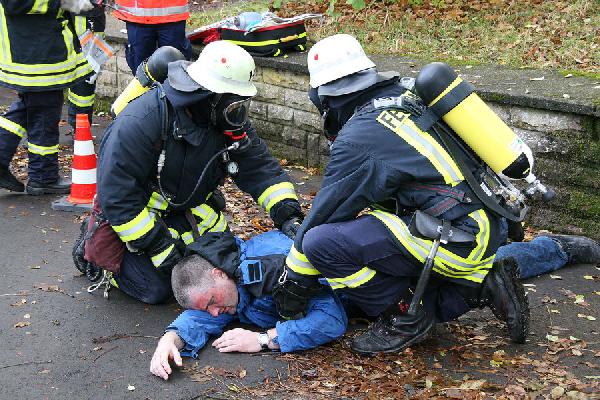 Doch um welche Chemikalie es sich genau handelt und welche Gefahren von ihr ausgehen ist wegen der ständig wechselnden Produktion zu diesem Zeitpunkt noch unklar. Deshalb wird die Einsatzstelle zuerst weiträumig abgesperrt und ein Trupp mit Atemschutzgeräten ausgerüstet. Dieser soll die Lage erkunden und die Verletzten schnellstmöglich aus dem Gefahrenbereich herausbringen.