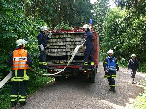 Als erstes galt es für die Kräfte der Feuerwehr den simulierten Brand im Engscheider Wald auf einer Fläche von mehreren 1000 Quadratmeter zu bekämpfen und einzudämmen. Da in Waldgebieten keine Wasserversorgung durch Hydranten vorhanden ist, musste das Löschwasser aus der Theel und den in der Nähe befindlichen Weiheranlagen über mehrere 100 Meter Schlauchleitung und Pumpen zur Brandstelle befördert werden.
