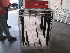 Das von der Wehrführung und Verwaltung entsandte dreiköpfige Abnahmeteam der Feuerwehr Eppelborn, (u. a. mit einem Kfz-Meister und dem hauptverantwortlichen Gerätewart) hatte nun die Aufgabe, die in den Ausschreibungsunterlagen geforderten Positionen zu überprüfen. Zwei Arbeitstage waren nötig, um das Fahrgestell mit der Ausschreibung zu vergleichen und den Aufbau zu kontrollieren. Der Aufbau, bestehend aus einem festem Koffer, zwei Geräteräumen für die Aufnahme der Ausrüstung und einer zweigteilten Ladebordwand soll auf der Ladefläche maximal acht Rollcontainer aufnehmen können. Standardmäßig werden vier davon mit je 500 Meter Schlauchmaterial ständig verlastet sein. Funktionalität und passgenauigkeit der bestellten Rollcontainer wurden mit dem Verlade-, Verzurr- und Sicherungssystem des Fahrzeugaufbaues abgeglichen.