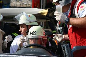 Durch nicht angepasste Geschwindigkeit ist ein PKW-Fahrer in den Abendstunden von der Straße abgekommen. Erst streift er mehrere Bäume, bevor der Wagen schließlich zum Stehen kommt. Der schwer verletzte Fahrer sowie der leicht verletzte Beifahrer sind eingeklemmt und können sich aus eigener Kraft nicht mehr aus ihrem Fahrzeug befreien. So die Ausgangslage für den ersten Teil der Übung.