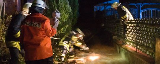Gegen 21:45 Uhr dann der erste Notruf: In der Hellbergstraße im Ortsteil Eppelborn drang Wasser in einen Keller ein. Mit Sandsäcken konnten die telefonisch alarmierten Einsatzkräfte aus dem Löschbezirk Eppelborn ein weiteres Überfluten der Kellerräume verhindern. Noch vor Ort erreichte die Einsatzkräfte ein weiterer Hilferuf: In der Hellbergstraße hatten die Wassermassen aus einem Entwässerungsgraben Geröll und Äste mitgerissen und einen Kanaleinlauf verstopft. Das Wasser hatte bereits die gesamte Straße überflutet und drohte, in Keller einzudringen. Hier wurden die Wassereinläufe geöffnet und gereinigt, um wieder eine Ablaufmöglichkeit in die Kanalisation zu schaffen.
