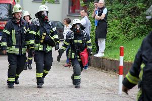 Ausgerüstet mit Atemschutz gehen Trupps in das Gebäude vor