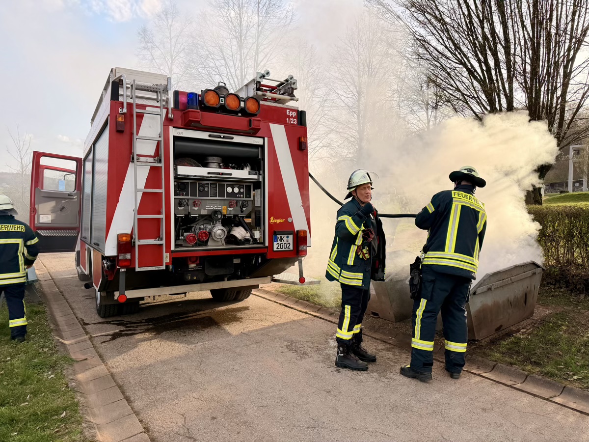Der Löschbezirk Eppelborn war um 16:31 Uhr alarmiert worden, nachdem Friedhofsbesucher Rauch und Flammen aus einem Abfallcontainer bemerkt und den Notruf gewählt hatten. Beim Eintreffen der Einsatzkräfte bestätigte sich die Meldung: In dem Container brannte Abfall.
