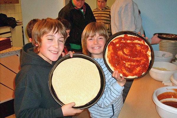 Doch vor dem Essen stand Arbeit an, denn die Pizzas mussten selbst hergestellt werden. In gemeinsamer Arbeit und unterstützt von ihren Jugendbetreuern wurden die zahlreichen Pizzaböden ausgerollt und von den Jugendlichen individuell belegt.