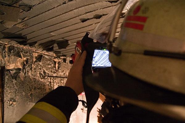 Mit der Wärmebildkamera der Feuerwehr Illingen wurden die betroffenen Zimmer mehrmals nach versteckten Glutnestern und weiteren Hitzequellen abgesucht. Erst danach konnten die Einsatzkräfte gegen 04:00 Uhr abrücken.