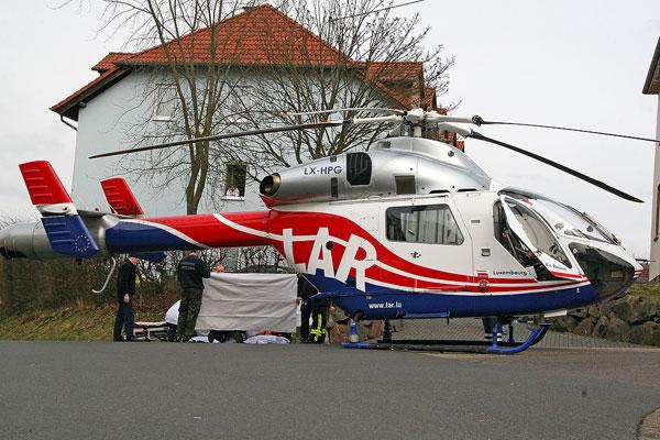 Der Weitertransport in eine Spezialklinik musste mit einem Rettungshubschrauber erfolgen. Doch da die Landung mitten auf einer Seitenstraße zwischenzeitlich zahlreiche Schaulustige angelockt hatte, mussten Einsatzkräfte des Löschbezirks Eppelborn den Patienten während des Umlagerns und der Vorbereitung auf den Transport mit Decken vor den Zuschauern abschirmen.