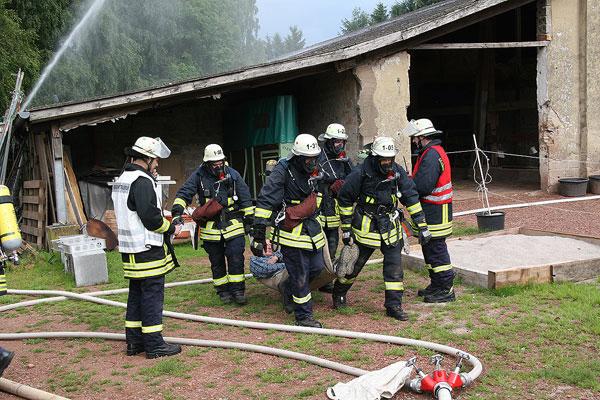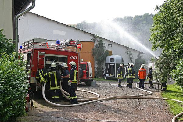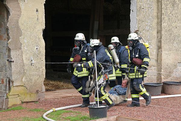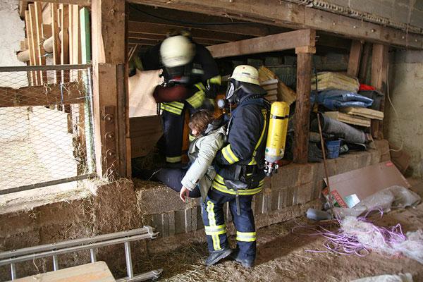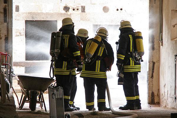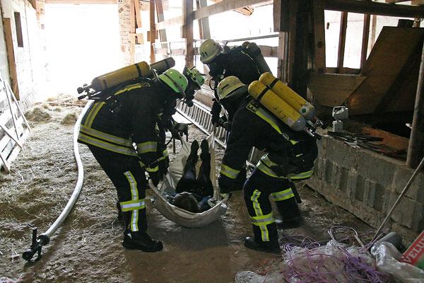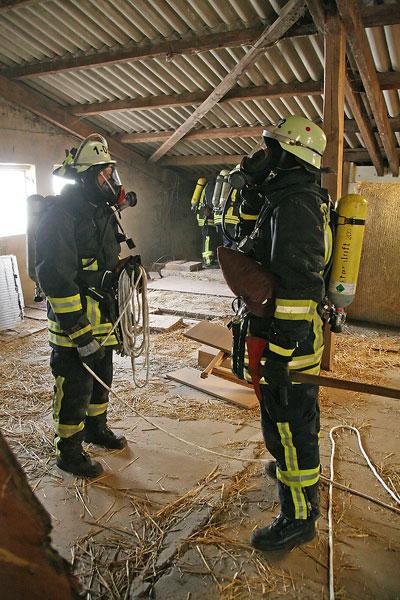 Die Scheune des Hofs steht in Flammen, insgesamt werden noch sieben Personen vermisst, erfahren die Einsatzkräfte bei ihrer Ankunft. Mehrere Trupps rüsten sich mit Atemschutzgeräten aus und beginnen, die Scheune nach den Vermissten abzusuchen. Parallel dazu beginnt der Löschangriff mit mehreren Rohren.