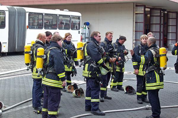 Der zweite Tag stand ganz im Zeichen von Einsatzübungen. In sieben Übungslagen wurden Kellerbrände, Küchenbrände, Zimmerbrände, Gaszählerbrände, Angriffswege über Treppenraum und über tragbare Leitern und Menschenrettung abgearbeitet. Große Hitze, Sichtweiten von nur wenigen Zentimetern und das unbekannte Gebäude kamen dabei realen Einsatzsituationen sehr nah. Immer dabei: Ausbilder der Landesfeuerwehrschule, die bei Gefahr sofort eingreifen können. Mehr als 25 Kilogramm wiegt die Schutzausrüstung eines Feuerwehrmanns, dazu musste zusätzliche Ausrüstung wie Axt und Schlauch mitgenommen werden. Beim Retten der 80 Kilogramm schweren Übungspuppen hatten viele Lehrgangsteilnehmer ihre persönlichen Leistungsgrenzen erreicht.