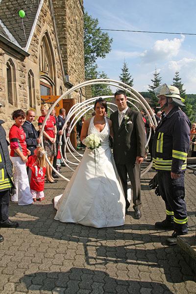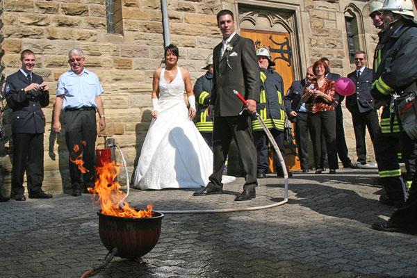 Als das Brautpaar nach dem Brautamt die Kirche verließ, warteten dort bereits der Fanfarenzug und die Kameraden aus dem Löschbezirk Eppelborn. Auch die Arbeitskollegen der Berufsfeuerwehr Saarbrücken waren gekommen und ließen die beiden ein Schlauchspalier durchschreiten. Löschbezirksführer Felix Becker, sein Stellvertreter Günter Klesen und Günter Schmitt vom Fanfarenzug gratulierten dem Brautpaar und überbrachten die besten Glückwünsche der Feuerwehrkameraden.