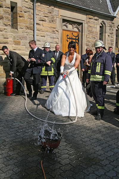 Vor dem Höhepunkt, der Fahrt im Korb der extra aus Lebach angerückten Drehleiter, mussten die beiden ihre Geschicklichkeit als Brandbekämpfer beweisen: Mit der Kübelspritze musste ein kleines Feuer gelöscht werden. Dabei zeigte Silke als frisch gebackene Feuerwehr-Ehefrau viel mehr Geschick im Umgang mit dem Strahlrohr als der Bräutigam: Bei ihm flammte der Brand wie durch Zauberhand immer wieder auf.
