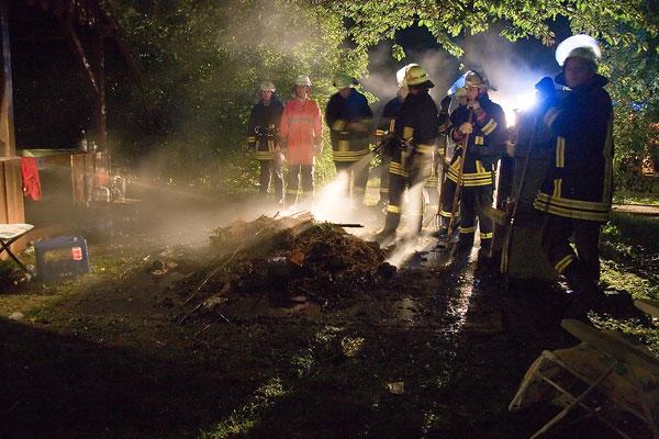 Auf der Suche nach Brennholz machten sie dabei auch vor der Grillhütte und einem erst im letzten Jahr neu errichteten Holzzaun nicht halt. Als dann auch noch Heuballen auf das Lagerfeuer geworfen wurden, hatten die Anwohner genug: Wegen der starken Rauchentwicklung riefen sie gegen 00:40 Uhr die Feuerwehr.