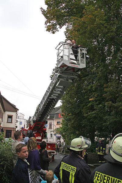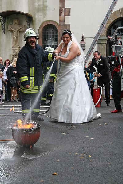 Davon hatte das Brautpaar noch nichts mitbekommen, als es aus der Kirche trat. Und zuerst standen nach alter Tradition noch Feuerwehraufgaben an, die von Braut und Bräutigam erfüllt werden mussten. Mit sicherer Hand befestige Eric eine Feuerwehraxt mit einem Knoten an einer Leine, doch beim anschließenden Einsatz der Kübelspritze bewies Nicole größeres Geschick: Sie konnte die Flammen entschieden schneller löschen, während das Feuer bei Eric immer wieder aufloderte. Mit der Drehleiter aus Illingen fuhr das Brautpaar dann in den siebten (Feuerwehr-)Ehehimmel.