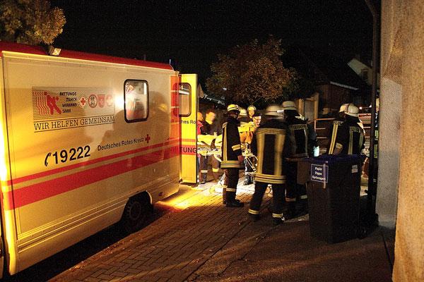 In Absprache mit dem Rettungsdienst wurde die Patientin nach der Erstversorgung durch den Notarzt mit einer Krankentrage und zahlreichen Helfern über eine schmale Treppe an der Rückseite des Hauses zum Rettungswagen gebracht. Die Drehleiter kam nicht mehr zum Einsatz.