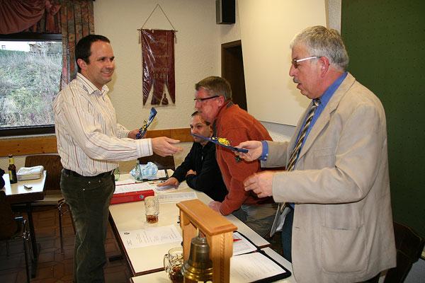 Im Namen aller Angehörigen des Löschbezirks überreichte Schriftführer Eric Holzer jeweils einen Gutschein an Löschbezirksführer Felix Becker und seinen Stellvertreter Günter Klesen. Er dankte den beiden damit für die Mehrarbeit, die sie oft hinter den Kulissen übers Jahr leisten und von der viele nichts mitbekommen.