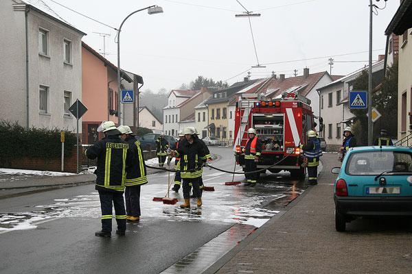 Mit Ölbindemitteln wurde die verschmutzte Fahrbahn gereinigt und der Ölfilm beseitigt. Dabei kam es vor allem durch die Arbeiten auf der vielbefahrenen B10 zu Verkehrsbehinderungen im Feierabendverkehr.
