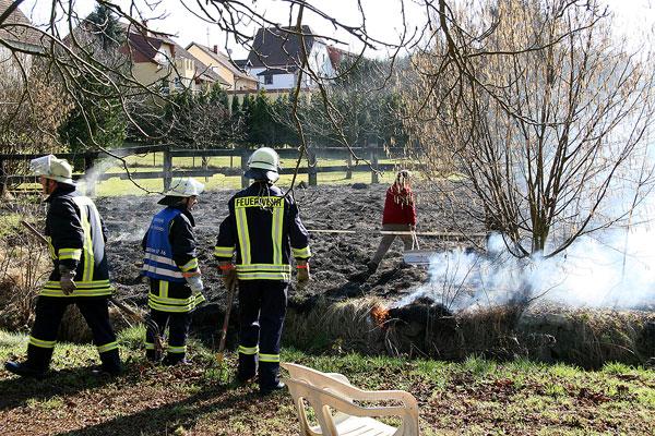 Beim Eintreffen der Feuerwehr waren die Flammen bereits wieder größtenteils erloschen. Vereinzelt mussten Glutreste mit Brandpatschen und einer Kübelspritze abgelöscht werden. Der ebenfalls zur Unterstützung nachalarmierte Löschbezirk Eppelborn konnte den Einsatz noch auf der Anfahrt abbrechen und einrücken.