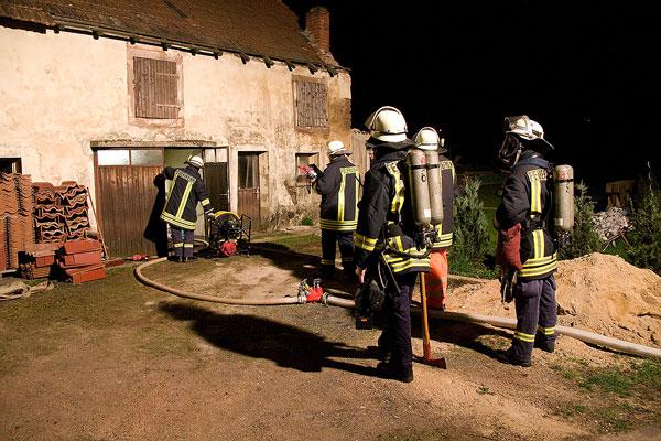 Nachdem die Haustür zu dem leerstehenden Anwesen nach Rücksprache mit der ebenfalls vor Ort anwesenden Polizei aufgebrochen war, drehte die Feuerwehr die zu dem Anbau führende Wasserleitung ab und deckte Reste von Brandschutt mit Löschschaum ab, um ein Wiederaufflammen zu verhindern. Durch die geplatzte Wasserleitung hielt sich der Schaden durch den Brand in Grenzen. Verletzt wurde bei dem Einsatz niemand. Die Ursache für das Feuer ist unklar.