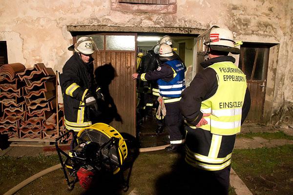 Die gegen 00:51 Uhr alarmierten Einsatzkräfte aus dem Löschbezirk Bubach-Calmesweiler trafen kurz nach dem Alarm an der Einsatzstelle ein. In einem nicht mehr benutzten Anbau, der zu einem leerstehenden Nachbarhaus gehörte, konnte das Feuer lokalisiert werden. Ein Trupp unter Atemschutz drang in die Räume vor und konnte den relativ kleinen Brand schnell löschen.