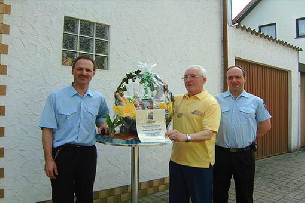 Die Kameraden der aktiven Wehr schickten ihren Löschbezirksführer Bernd Detzler und Thorsten Fuchs, seinen Stellvertreter, mit reichlichen Geburtstagsgrüßen in die Humeserstrasse.