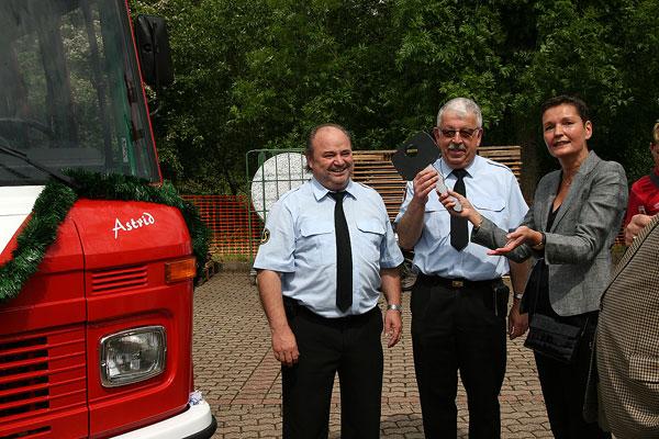 Die Ehefrau des Ministerpräsidenten Astrid Gerke-Müller taufte das Fahrzeug auf den Namen "Astrid". Das bisherige Mannschaftstransportfahrzeug ist abgemeldet und soll verkauft werden, erläuterte Felix Becker, Löschbezirksführer des Löschbezirks Eppelborn. Das neue Fahrzeug wird die Feuerwehr Eppelborn bei größeren Einsätzen durch den Transport von Feuerwehrleuten und bei der Einsatzkoordination vor Ort ideal ergänzen.