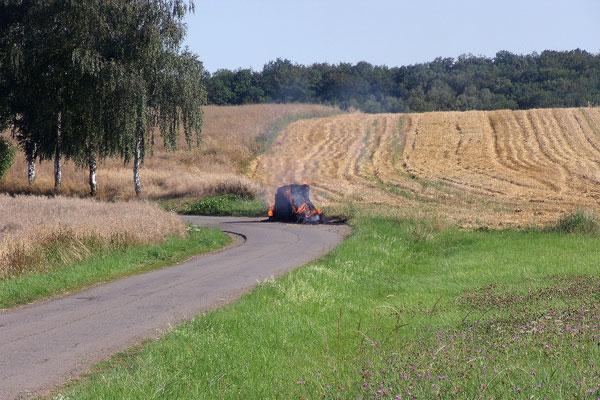 Es gelang ihm, den Ballen auszuwerfen und den Traktor mit der Arbeitsmaschine in Sicherheit zu bringen. Gegen 18:08 wurden dann die Löschbezirke Wiesbach und Eppelborn zu der abgelegenen Einsatzstelle in der Verlängerung der Römerstraße alarmiert.