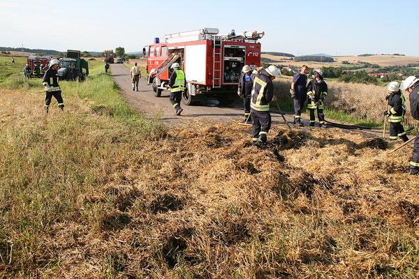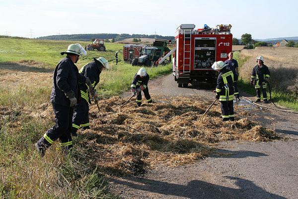 Die Einsatzkräfte begannen nach der Ankunft an der Einsatzstelle, den brennenden Strohballen abzulöschen. Um auch die letzten Glutnester zu finden, musste der Ballen geöffnet und auseinander gezogen werden. Der Brand konnte schnell gelöscht werden.