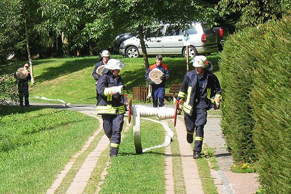Es musste eine unabhängige Wasserversorgung von einem angrenzenden Weiher in Richtung der Einsatzstelle nahe der Kapelle aufgebaut werden. Die Wasserentnahme wurde mit der Tragkraftspritze des LF 16/TS durchgeführt. Im weiteren Verlauf wurden durch das Personal des LF 16/TS mehrere C-Rohre zur Brandbekämpfung vorgenommen.