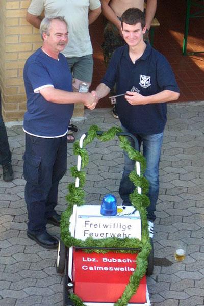 Im Laufe des Abends fand auch eine Fahrzeugeinweihung statt. Dem Löschbezirk Bubach–Calmesweiler steht nun eine Kehrmaschine zur Beseitigung von größeren Ölspuren zur Verfügung. Diese Kehrmaschine ist eine Spende an den Löschbezirk und wurde von den Kameraden mit einem „Feuerwehrlook“ versehen. Alle Teile wurden in Feuerwehrrot umlackiert. Ebenso wurde ein Blaulicht und Blitzer angebaut und eine Beschriftung angebracht. Ellen Schmitt, aktive Feuerwehrfrau im Löschbezirk, stand Pate für die neue Kehrmaschine, die Löschbezirksführer Wolfgang Braun an Gerätewart Fabian Müller übergab.