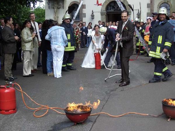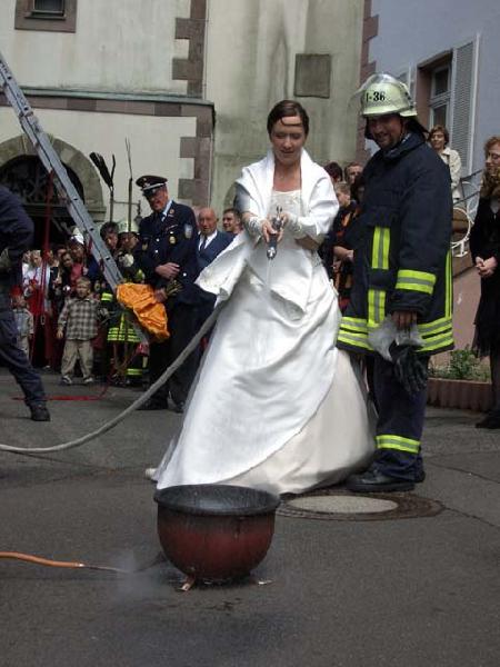 Als weitere Prüfung galt es dann, gemeinsam mit der Kübelspritze ein Feuer zu löschen. Wie auch schon bei den Hochzeiten anderer Feuerwehrkameraden zeigte sich wieder einmal, dass die frischgebackene Ehefrau die Flammen sehr viel schneller als der einsatzerfahrene Bräutigam bändigen konnte.