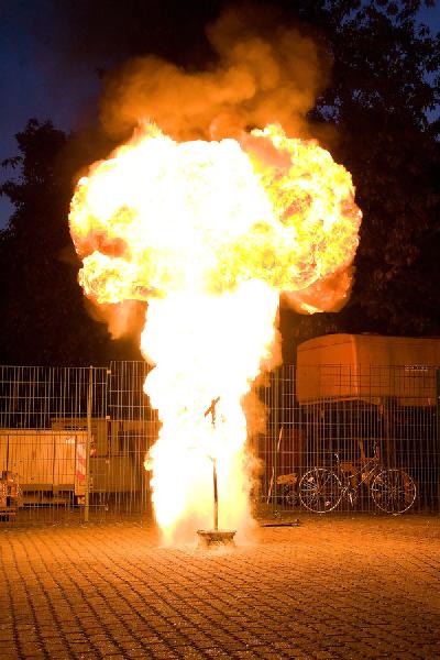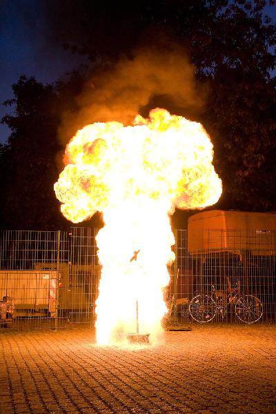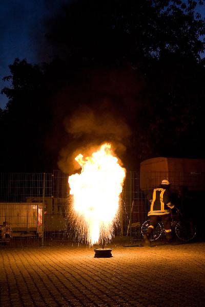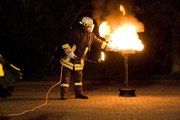 Eppelborn. Meterhoch schießt die Stichflamme in den Himmel vor dem Feuerwehrgerätehaus in Eppelborn. Gerade hat ein Feuerwehrmann versucht, brennendes Öl mit Wasser zu löschen und dabei eine gefährliche Fettexplosion ausgelöst. Kein Unfall, sondern Teil der Brandschutzausbildung, die am 14. Oktober 2009 für Pflegekräfte des Seniorenheims St. Josef bei der Feuerwehr in Eppelborn stattfand.