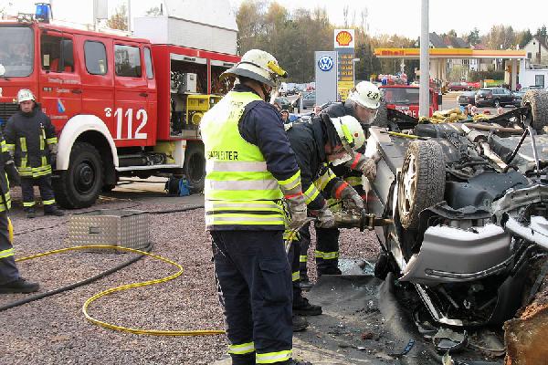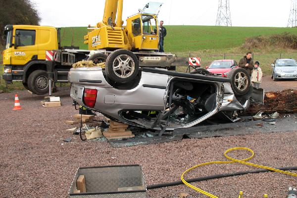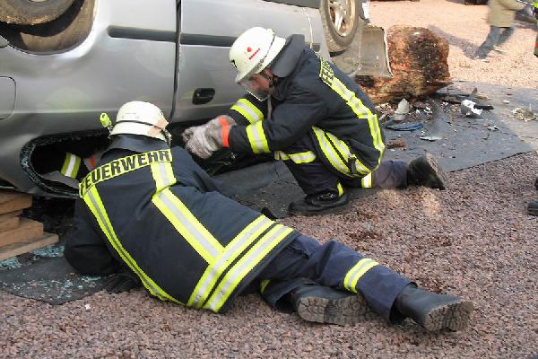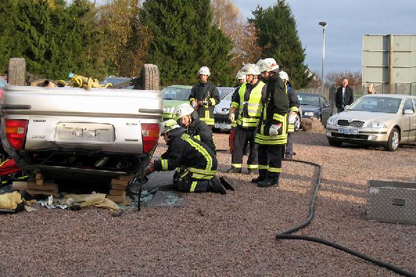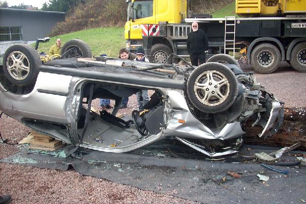 Als Übungsobjekt stand ein PKW, besetzt mit einer Puppe zur Verfügung, der mit ca. 60 km/h gegen einen Baum geprallt war. Dieser Zusammenstoß wurde unter Regie eines Sachverständigenbüros von der Waagerechten in die Senkrechte übertragen. Das heißt, der PKW wurde an einem Autokran ca. 15 Meter in die Höhe gezogen und dann auf den auf dem Boden liegenden Baumstamm herunterfallen gelassen. Nach dem Aufprall auf den Baumstamm blieb das Unfallfahrzeug auf dem Dach liegen.