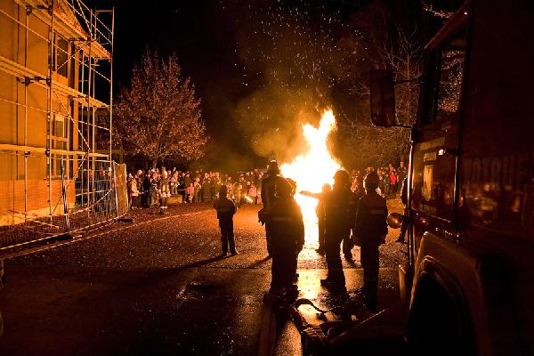Die Besucher bestaunten das große Martinsfeuer, das mit hellen Flammen in der Dunkelheit niederbrannte. Im Anschluss gab es für die Kinder die ersehnten Martinsbrezeln und Kinderpunsch, für die Eltern wärmenden Glühwein.