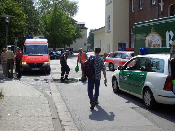 Ein Rettungssanitäter der Feuerwehr und zwei weitere Kräfte machen sich sofort auf den Weg zu dem Patienten und finden ihn bewußtlos und in einer Blutlache liegend auf der Straße vor. Aufgrund des lebensbedrohlichen Zustandes alarmieren die Einsatzkräfte Notarzt und Rettungswagen und übernehmen die Versorgung und Betreuung des Patienten bis zu deren Eintreffen.