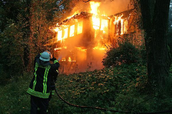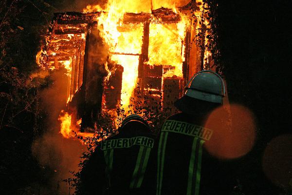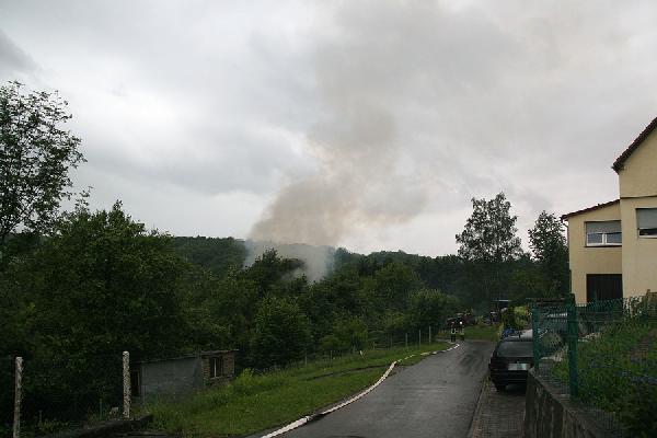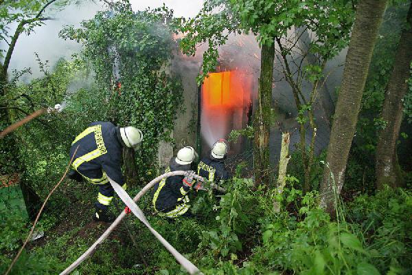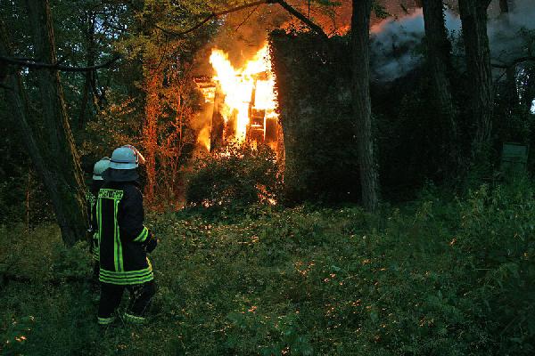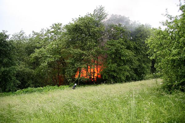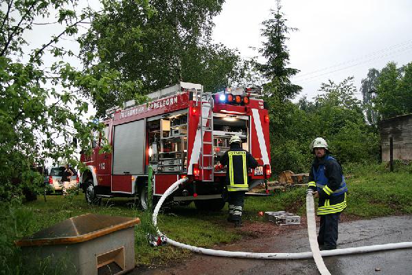 Während des starken Unwetters am 06. Juni 2010 schlug ein Blitz direkt in ein abseits in einem Waldstück stehendes und als Geräteschuppen genutztes Gartenhaus ein und setzte das zweigeschossige Gebäude in Brand. Als der Besitzer, aufgeschreckt durch den lauten Knall, das Feuer bemerkte, alarmierte er umgehend die Feuerwehr.
