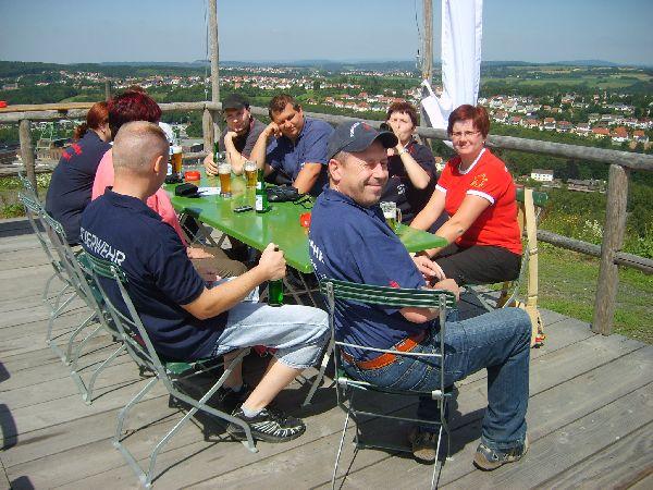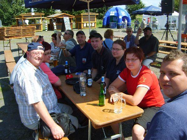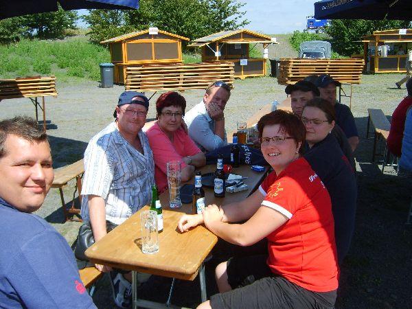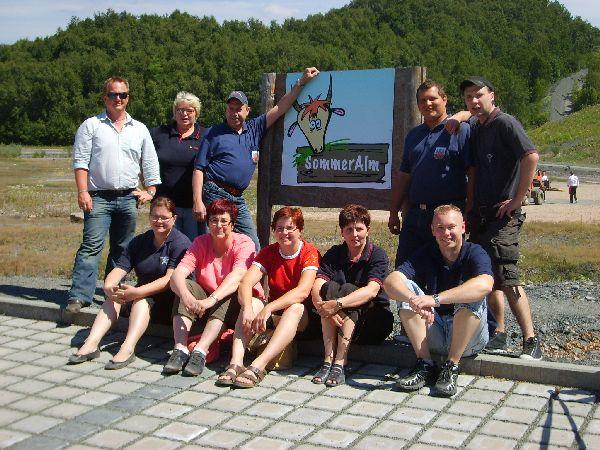 Das vordergründige Ziel war das Erklimmen der Sommeralm in Landsweiler bei Neunkirchen. Die Sommeralm, eine riesige Schlackenhalde, direkt neben dem Gondwana-Park, hat eine stattliche Höhe von der aus man über das Ganze Saarland blicken kann. Gemeinsam erklommen wir die Anhöhe bei einem ganz tollen, warmen Wetter. Oben angekommen hatten wir schon Risse im Gesicht, so ausgetrocknet waren wir. Diese Risse ließen sich aber problemlos schließen durch Zuführung von feinstem Weizen- und Pilsbier. Innerhalb kurzer Zeit war der Wasserhaushalt wieder hergestellt und unsere Gäste, sowie auch wir waren begeistert von der Idee der saarländischen Sommeralm.