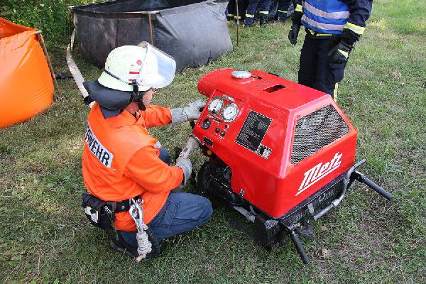 Deshalb musste Wasser über eine größere Entfernung beigeschafft werden. Mit einem Tanklöschfahrzeug wurde ein Pendelverkehr eingerichtet. Als "Zwischenspeicher" dienten vor Ort dabei mehrere Faltbehälter, jeder mit einem Fassungsvermögen von 3.000 Litern. Von dort wurde das Löschwasser mit einer Tragkraftspritze angesaugt und in die Schlauchleitungen der Angriffstrupps gepumpt. "Bei einem realen Einsatz kämen natürlich mehrere wasserführende Fahrzeuge aus der Umgebung mit zum Einsatz", erklärte der stellvertretende Löschbezirksführer Dr. Frank Schwan in der Nachbesprechung zur sehr gut verlaufenen Übung.