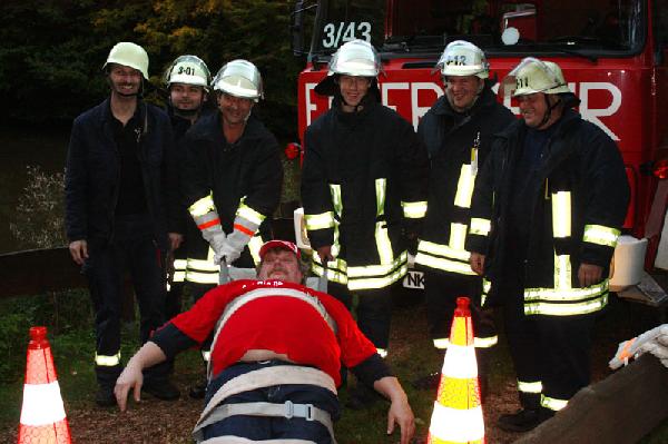 Er wurde von den Kameraden bestens versorgt und auf die Krankentrage gebettet, und damit ihm nichts zustößt mit einem C-Schlauch fest verzurrt, damit er auch noch die nächsten 50 Jahre heil übersteht. "Nochmals alles Gute für die nächsten 50 Erwin".
