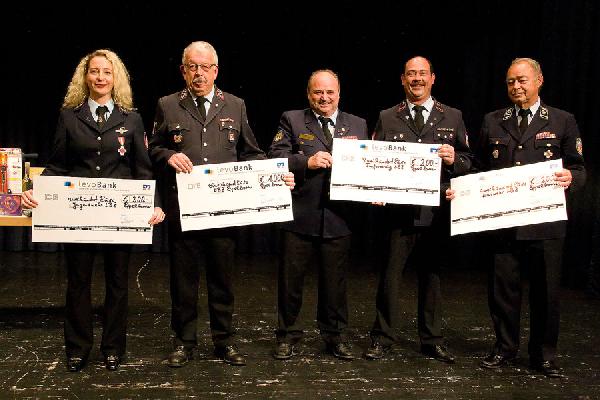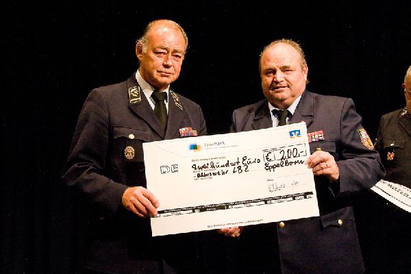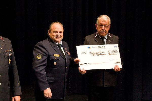 Unter großem Beifall überreichte der Vorsitzende des Fördervereins Günter Schmitt Schecks zur Unterstützung der Feuerwehrarbeit im Löschbezirk. So erhielten die Einsatzabteilung 100 Euro, jeweils weitere 200 Euro gingen an die Jugendfeuerwehr, die Alterswehr und den Fanfarenzug.