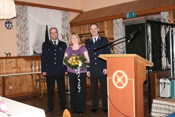 Löschbezirksführer Bernd Detzler ließ es sich nicht nehmen noch besondere Verdienste zu erwähnen, und überreichte Thorsten Fuchs für 10 Jahre Tätigkeit als Gerätewart einen Gutschein. Heike Blum wurde für Ihre Arbeit der Festschrift „100 Jahre Löschbezirk Dirmingen 2010“ mit einem Blumenstrauß recht herzlich gedankt.