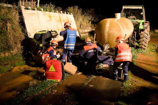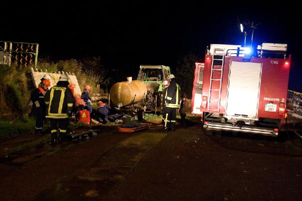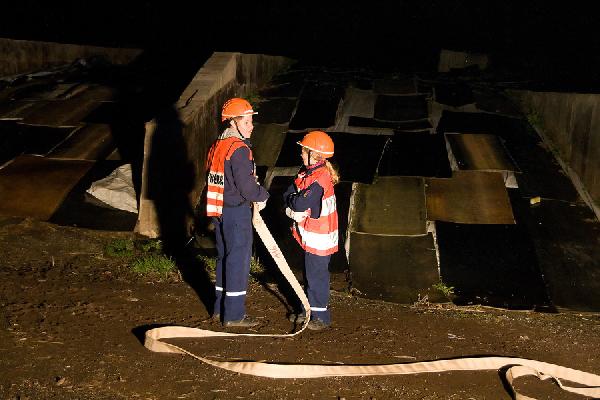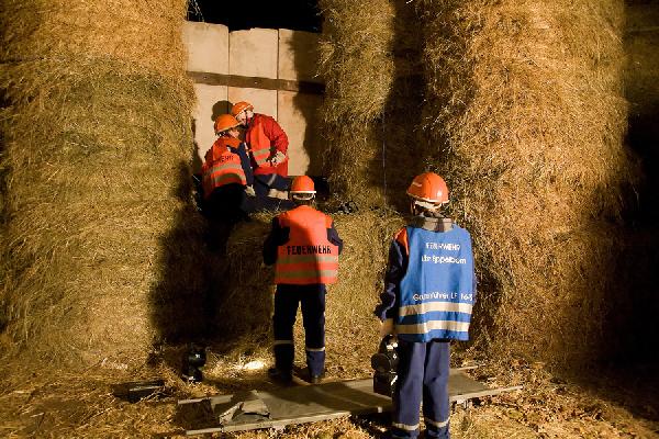 Dabei war vor allem das Ausleuchten der Einsatzstelle von besonderer Bedeutung, denn auf dem abseits gelegenen Hof war es stockfinster. Schnell hatten die Jugendfeuerwehrleute Scheinwerfer aufgebaut und die Lichtmasten der Einsatzfahrzeuge in Stellung gebracht. Während der Löschangriff auf die Scheune aufgebaut wurde, begannen andere Trupps mit der Suche der Verletzten in der Dunkelheit.