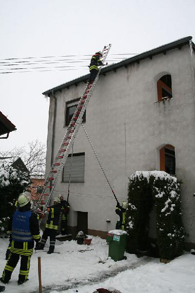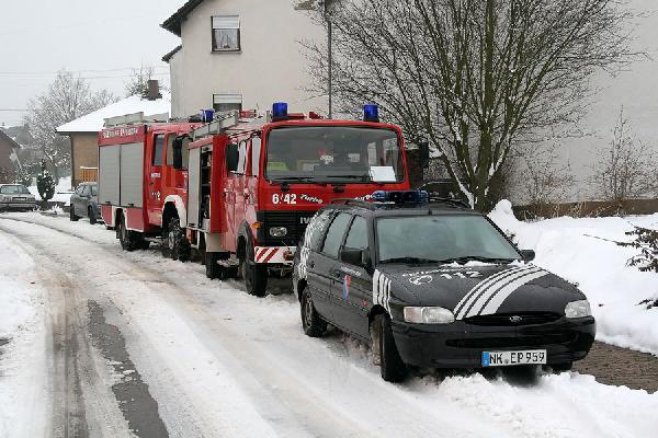 Da die Dachfläche durch eine dicke Eisschicht nicht begehbar war, musste das Eis mit Beilen über eine Leiter entfernt werden. Dazu wurde auch der Löschbezirk Eppelborn mit der langen Schiebleiter zur Unterstützung gerufen.