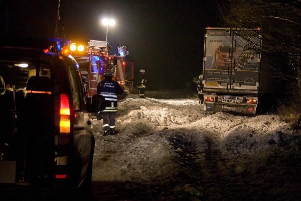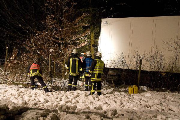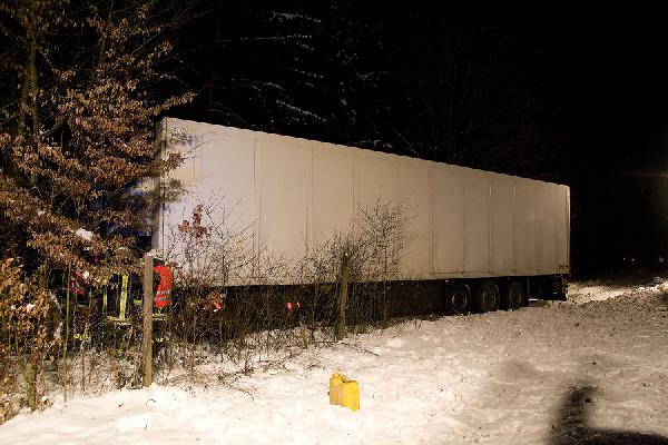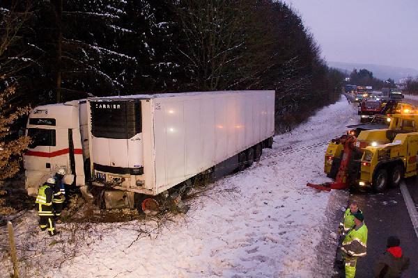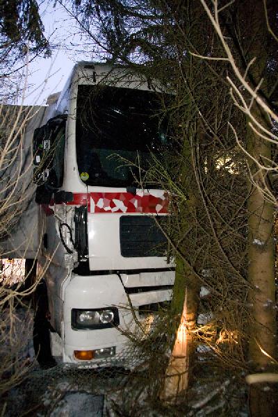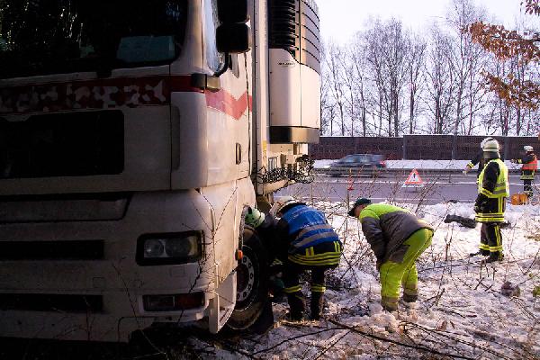 Eppelborn. Aus noch unbekannter Ursache kam der Fahrer eines mit Obst beladenen Sattelzugs am Morgen des 05. Januar 2011 auf der Autobahn 1 zwischen den Anschlussstellen Eppelborn und Illingen mit seinem Fahrzeug in einer langgezogenen Rechtskurve von der Fahrbahn ab. Der schwere Lastwagen durchbrach einen Zaun und streifte einige Bäume, bevor die Zugmaschine knapp vor mehreren Bäumen zum Stehen kam.