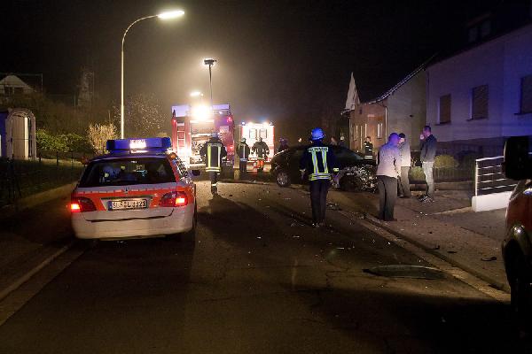 Bubach-Calmesweiler. Es muss ein gewaltiger Knall gewesen sein, mit dem die Anwohner der Weihereckstraße im Eppelborner Ortsteil Bubach-Calmesweiler in der Nacht zum 02. April 2011 aufgeschreckt wurden: Offenbar mit hoher Geschwindigkeit war ein mit zwei Personen besetzter Seat auf ein am Fahrbahnrand geparktes Fahrzeug geprallt und gegen eine Mauer geschleudert.