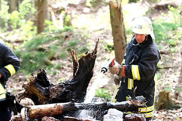 Der Löschbezirk Dirmingen, der gegen 12:34 Uhr alarmiert wurde, löschte die Brandstelle ab und verhinderte, dass sich das Feuer durch Funkenflug auf umliegendes Laub und Gehölz ausbreiten konnte.