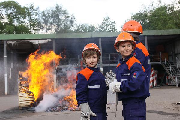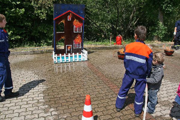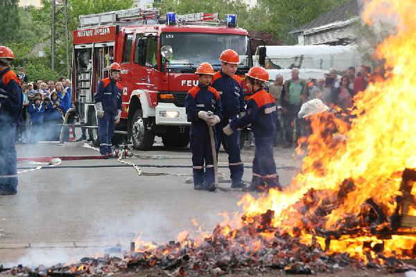 Auch die Jugendfeuerwehr hatte einen großen Auftritt: Vor zahlreichen Zuschauern rückten sie mit Blaulicht und Martinshorn an, um ein richtiges Feuer zu löschen. Besonders die jungen Zuschauer waren dabei "Feuer und Flamme" und bestaunten mit großen Augen die Übung.