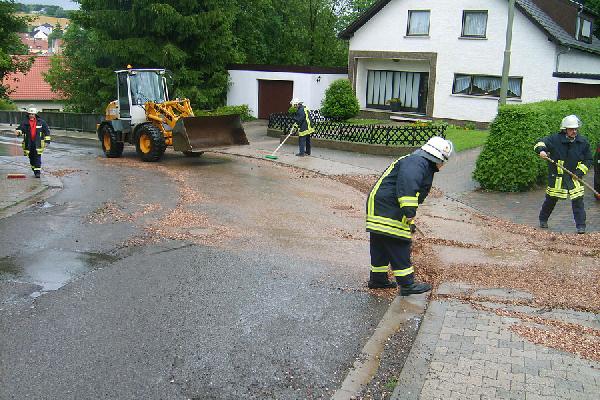 In der Calmesweiler Straße wurde die Feuerwehr aus Bubach-Calmesweiler mit einem Radlader von einer angrenzenden Baustelle unterstützt, um Geröll und Kies von der Fahrbahn zu räumen. Dort war auch Wasser in einen Keller eingedrungen, das von den Einsatzkräften mit einer Tauchpumpe abgepumpt werden musste.