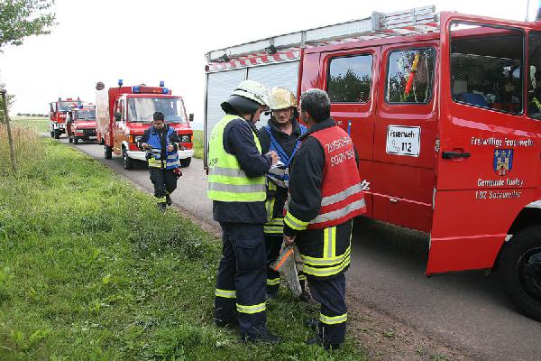 Die Schwierigkeit dabei war, dass die An- und Abfahrt der großen Löschfahrzeuge koordiniert werden musste, da auf der schmalen Zufahrtstraße ein Begegnungsverkehr nicht möglich war. Der Löschbezirk Dörsdorf hatte dazu einen eigenen Einsatzabschnitt gebildet und dirigierte die 5 Tankfahrzeugen per Funk durch das Nadelöhr.