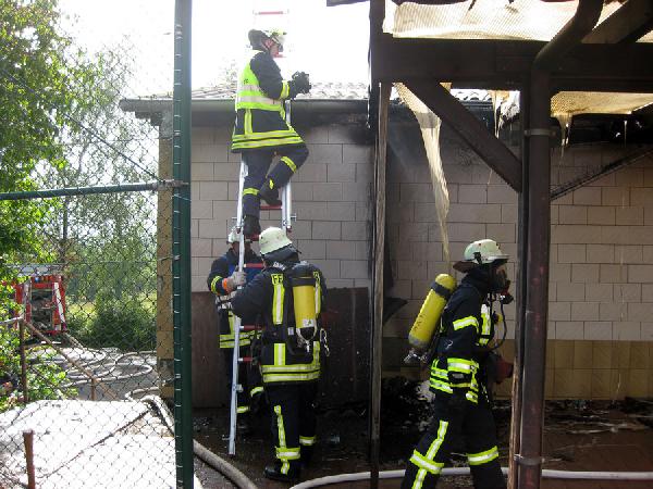 Die Löschbezirke Hierscheid, Humes und Eppelborn wurden gegen 16:57 Uhr von der Kreisalarmzentrale Neunkirchen alarmiert, nachdem Anwohner das Feuer über den Notruf gemeldet hatten. Beim Eintreffen der ersten Einsatzkräfte hatten Mitglieder des Boule-Clubs bereits mit ersten Löschversuchen begonnen. Ausgerüstet mit Atemschutzgeräten wurden Glutnester unter der Dacheindeckung gesucht und abgelöscht. Dabei wurde auch eine Wärmebildkamera zum Aufspüren der Glutnester zur zur Nachkontrolle eingesetzt.