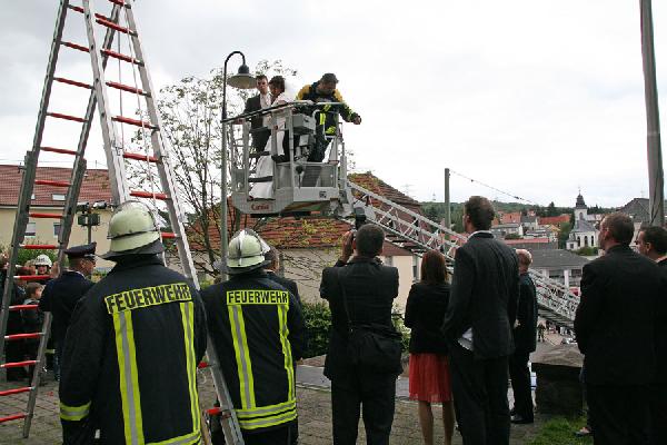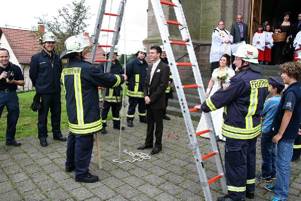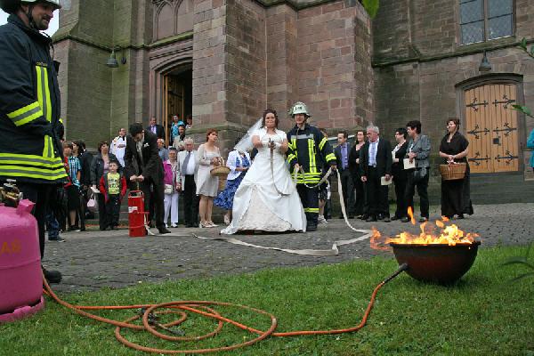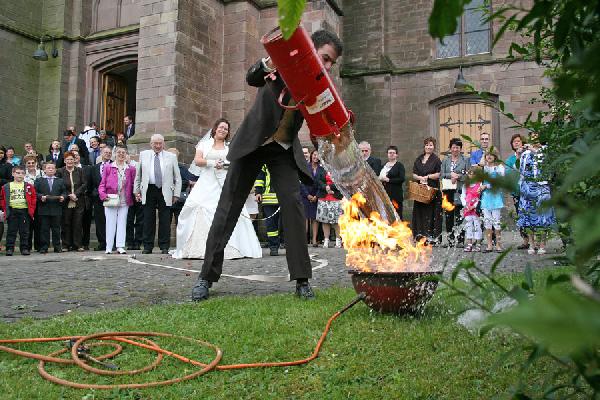 Zuerst musste Tobias an einer Feuerwehraxt mit einer Leine demonstrieren, dass er die wichtigen Feuerwehrknoten in jeder Situation beherrscht. Ganz traditionell sollte das Brautpaar dann an der Kübelspritze seine Löschkünste beweisen. Doch die Technik streikte: So sehr Tobias auch pumpte, es kam einfach kein Wasser aus der Spritze. Doch der Bräutigam wusste sich zu helfen, schnappte die Kübelspritze und ertränkte die Flammen kurzerhand.