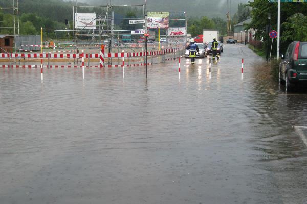 Doch dann ging es Schlag auf Schlag: Immer Notrufe über überflutete Straßen und vollgelaufene Keller gingen bei der Feuerwehr ein. Mehr als 35 Liter Regen fielen dabei in einer halben Stunde pro Quadratmeter. Dadurch waren nicht nur Regenrinnen überlastet: Die Kanalisation konnte die Fluten nicht mehr bewältigen, so dass es zu Wasseraustritt aus Toiletten und Kanaleinläufen kam. Sogar die schweren gusseisernen Kanaldeckeln wurden an manchen Stellen durch den großen Druck aus ihrer Verankerung gehoben.